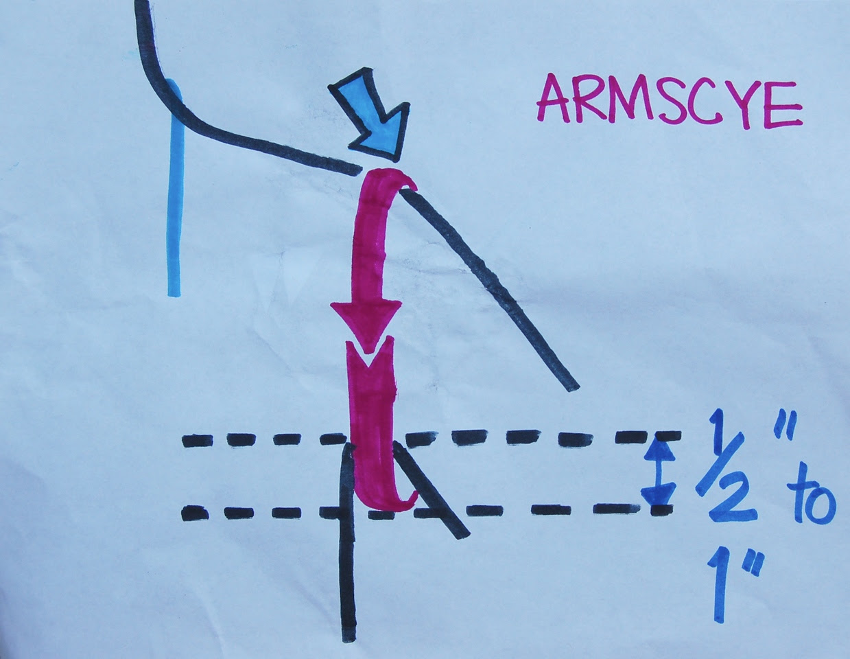 Without jumping ahead of myself to sleeve drafting, I will say that a smaller armscye generally fits better but it also means a tighter sleeve cap (and no, no cheating with puff sleeves). As you draft more, you will eventually find what works for you - that happy compromise between armscye depth and sleeve cap ease. For now, let's try 1" and you can decide, from your muslin, if you like it or not.