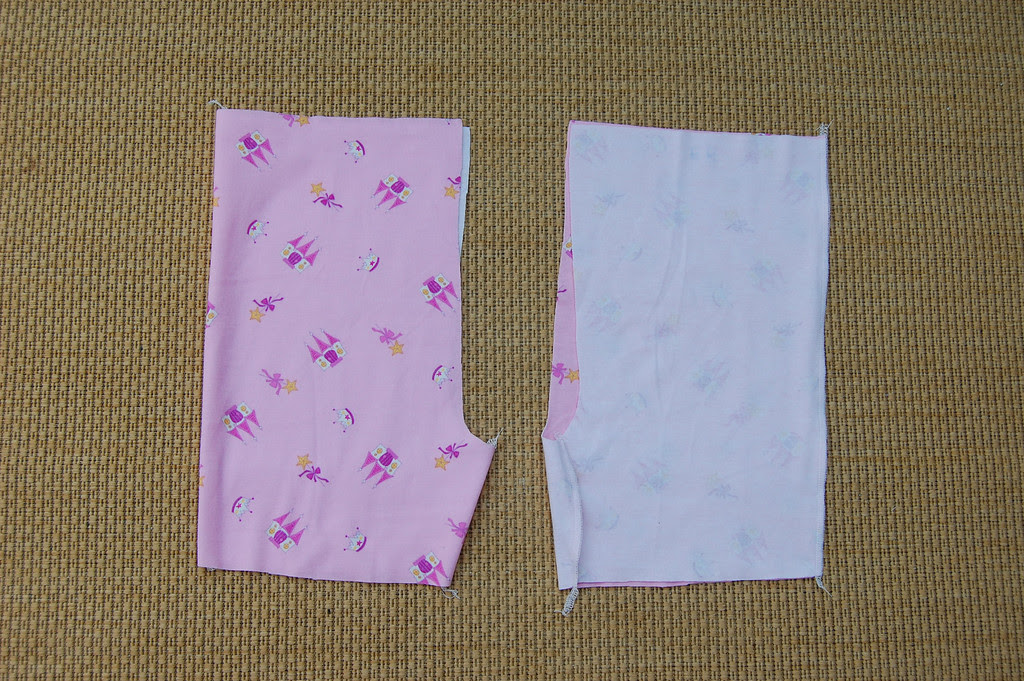 - Place a front piece and a back piece together with right sides of the fabric facing in. Do the same for the other pair of front and back pieces.