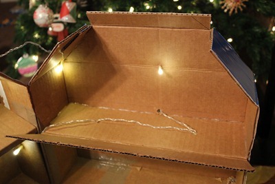 Again, the options are endless. Perhaps you’ll run all the wires on the outside of the house, poking holes here and there and sticking the lights through to the inside. Perhaps you’ll run all the wires on the inside of the house and tape them down or cover them with another layer of cardboard. I did a bit of both. Whatever you decide, I recommend holding the lights in place with masking tape until you get a configuration that fits the way you want. And THEN start poking holes for the lights to go through.