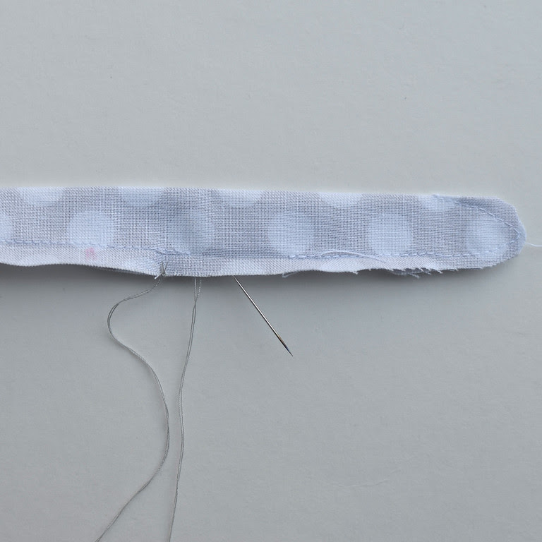 till it emerges at the other opening. The entire tube will bunch up, especially as you begin pulling the rest of the trailing thread out behind the needle. Invert the end of the strap with the knot through the strap and slowly pull the thread till the end turns right side out through the strap, following the thread.